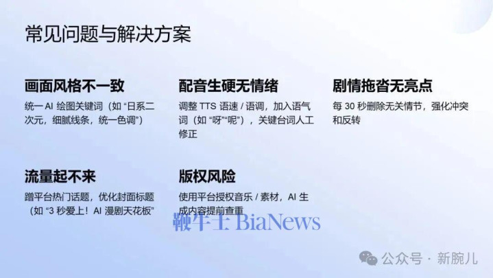 我们自己研究出来一些常见的问题和解决方案。第一,画面风格不一致。其次是AI配音,动漫行业声优大于一切,如果声优不好就废了。
