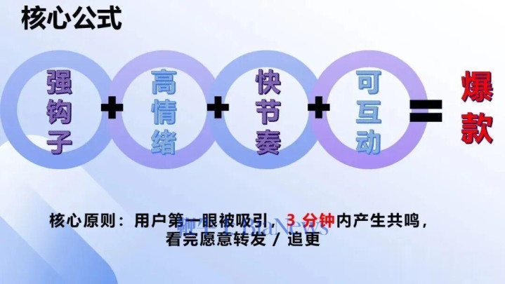 核心的公式是什么呢?就是这里:第一,强钩子;第二,高情绪;第三,快节奏;第四,可互动。